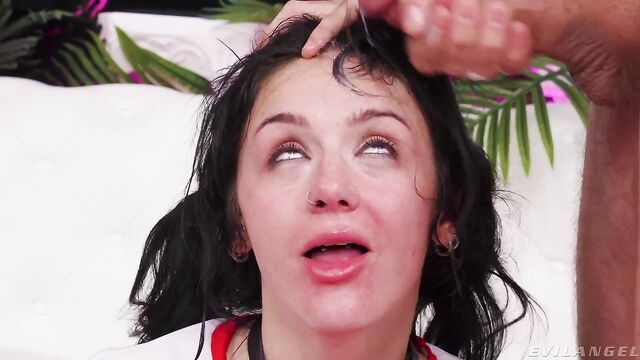 Description: Dark-haired babe Rosalyn Sphinx wears sporty attire: a cropped tee, red shorts, shin pads and sneakers with a transparent backpack. Dominant stud Nade Nasty lifts the petite doll's top and plays with her small tits. He has her choke up spit that she drools onto her chest. Nade spanks her jiggling but cheeks. He spreads her ass and fingers her pussy. Rosalyn sucks his cock. Long strands of sticky spit ooze as he fucks her mouth. She buries his long cock with a deepthroat blowjob. Nade puts her on the floor and slam-fucks her pussy. Rosalyn sucks on a clear dildo while he bones her cunt. The rough sex stud uses his foot to press her face to the floor while pounding the submissive girl's slit. Nade fishhooks her mouth. Rosalyn masturbates with a toy stuffing her gullet! He rails her snatch, pile-driving her into the floor! She gives him a rim job. The action climaxes as Nade soaks the vixen with a massive load that drizzles onto her pretty face.