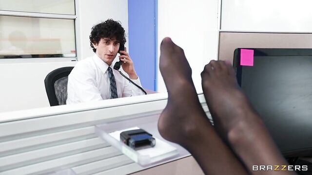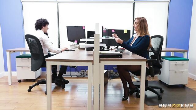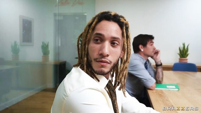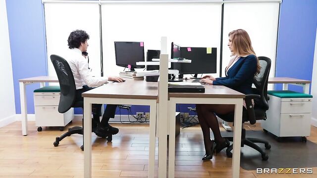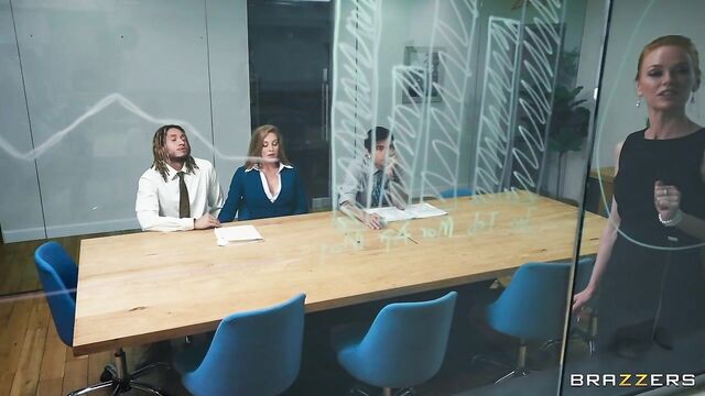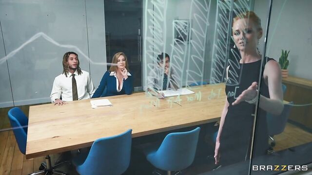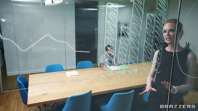 Description: Annie King works in an office. Some days she feels a little bit slutty, and on those days, she takes her pick of the young men around the office. Today's lucky guys are Derek Savage and Nick Strokes, who both end up in the bathroom with Annie, while a boring meeting drones on in the next room. Annie gives both guys a hot double blowjob, before letting them tag team her pussy!