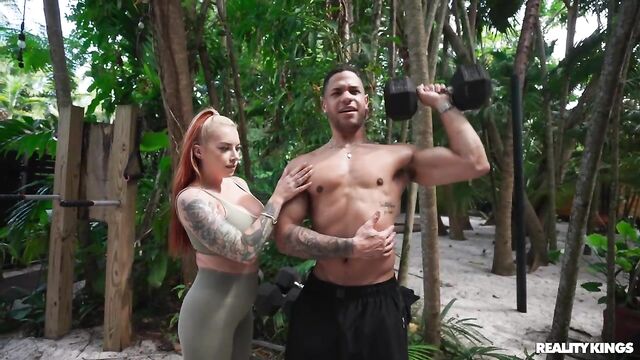 Description: Cubbi Thompson wants to show off a bit, so she makes sure to warm up before the hot guy she invited, Mike Ox, shows up at the outdoor gym. Cubbi's also showing off her big fake tits in her tight little workout bra, and Mike appreciates the view. She takes her top off to spot him with her boobs in his face, then sucks and titty fucks him while he does his reps. Cubbi gets her workout in riding his dick, then sucks him till he shoots a record-breaking load!
