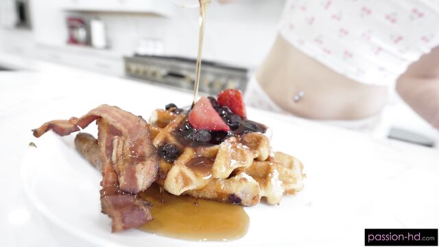 Description: Gracey treats her man to breakfast in bed with waffles and pussy!
