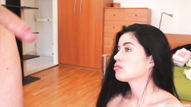 Description:Hungarian April Blue looked seriously hot in her basque and panties. She pulled her panties over her round ass and stripped naked before leaning over to suck my cock. Her eyes were piercing and I filmed this action in POV, you can imagine looking into her eyes as she works on your shaft. She performed a sensual blowjob and sucks on my balls before I wanked myself off and covered her cheeks with my cum. That didn't stop April carrying on and sucking me clean though!