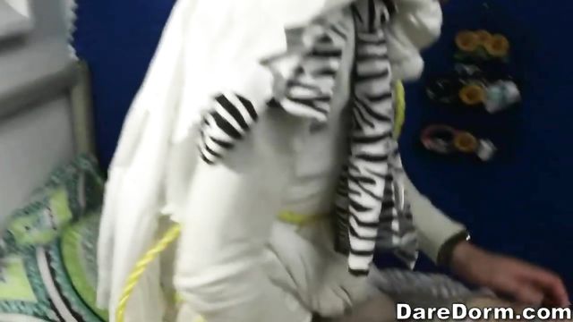 Description:Its college and whats a dorm room without a toga party! These friends decided to get creative with their games besides the usual truth or dare. That led to a game of freeze and get your dick sucked toga style. After that it was 4 girls going at it with ea