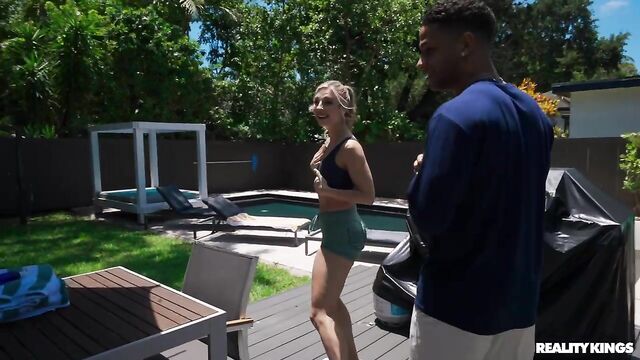 Description: Cheerleader Kait and Mike Ox are super hot after their run and don't have any water, but they're right by a house with a pool, and Kait the owners are never home. She convinces Mike to sneak in and cool down in the water, and they strip down and start splashing. Mike oils up Kait's ass and soon is fingering her tight backdoor, and Kait wants that cock. They picked the wrong day, because the homeowner shows up while Mike is pounding Kait's ass doggystyle. They're too horny to leave, so they sneakily fuck in the yard till Mike gives the blonde an anal creampie!