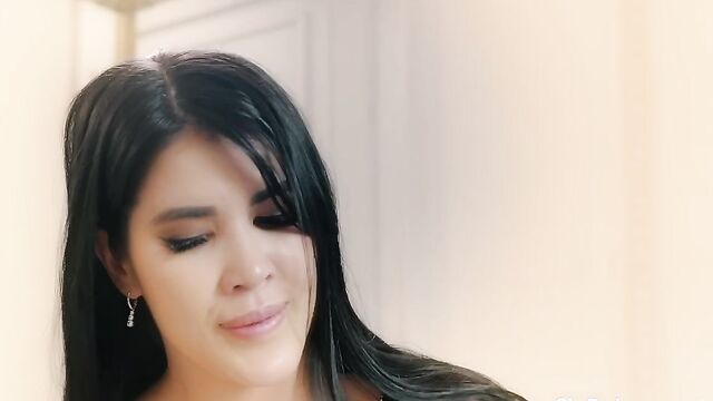 Asian angel in black stockings Lady Dee is jumping on a big cock