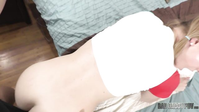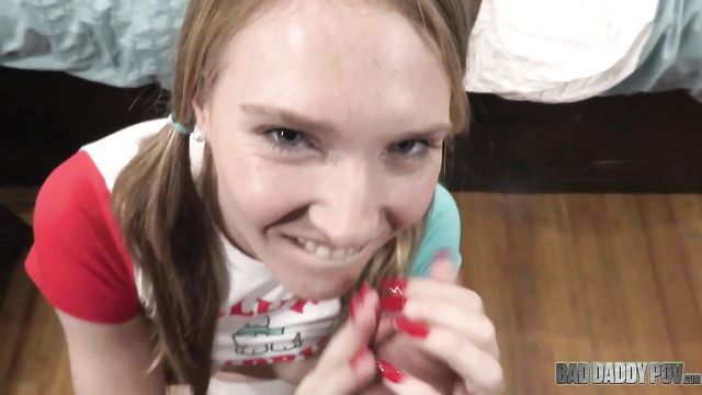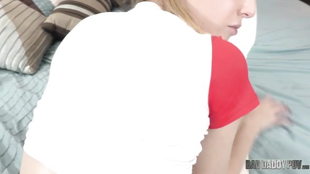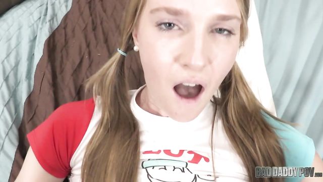 Description:Ashley Lane is dressed to kill, or rather to make someone cum. Her shirt literally says ‘slut’ on it. Today, we’ll being seeing through this in the POV of her stepdaddy. Since she is dressed for the occasion, she now invites us to play for a bit. She entices her stepdaddy with a dirty look which naturally worked for him. He reaches over to touch her ass and some light, over-the-clothes pussy strokes. Ashley likes it. She now sits upright to offer her tits to him. He lifts her shirt to show her petite figure. He liked what he saw so he politely asks our star to suck on his dick. Playtime starts now. She happily lick every nook and cranny of step daddy’s cock. He now bends her over to rub his throbbing dick on her ass and starts taking her bottoms off. He penetrated her shaved pussy from behind and she lets out a happy little moan. With an increasing intensity, he flips her over to let their eyes meet and also to see her cute tits. This goes on for a while. Stepdaddy now lies down to let her take control. She gave him a head while speaking few dirty things for her stepdaddy. She gets up to shove the length of it inside her. At this time, she did most of the work. She goes around facing the other way, suck him off and do it all over again to show her stepdaddy that she can step up to make him happy. To finish this act, stepdad now slams her to the bed to pound her sloppy pussy. Little did we know, her tits can jiggle more wildly when stepdaddy gets a little rougher. He drags her now to the floor to kneel and wait for his nut. He jacks it off and let it out on her mouth. He delivers his love for Ashley by letting her swallow all of it.
