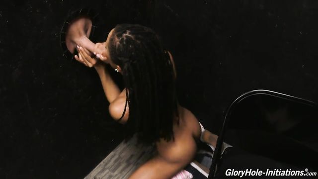 Skinny ebony hottie Kira Noir sucks a white dick in the gloryhole
