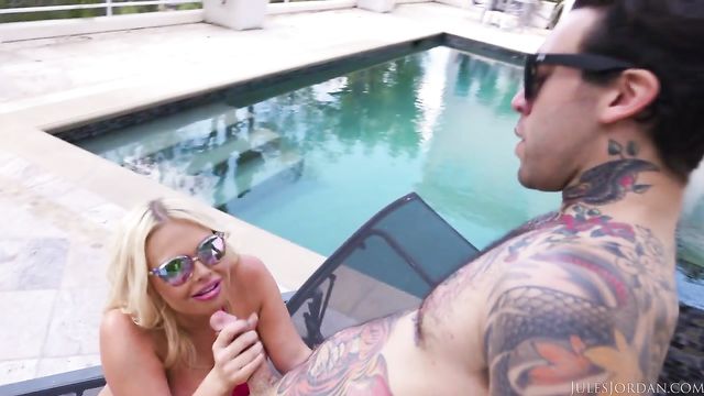 Description: Blondie with the angelic face, Jesse Jane is ready to be pampered and drilled in this scene from Jules Jordan.com. The thick beauty is adorned in a magnificent bikini that runs with color and complex webbing that holds her biggins’ in place. Propped in sunglasses the teaser-pleaser wiggles in the sun. There’s something special about blondes in bikinis and Jane doesn’t disappoint during the well shot, sun-soaked sequence… The vixen winds down poolside and a fully tatted “Small Hands” appears with a drink for the reclined starlet. She takes a sip then accepts a request to be spritzed. The eager servant sprays with a smile then hits her big tits and pussy. Way to take advantage of the opportunity. The couple sneak away to a hidden gazebo and Jesse Jane goes to work on Small Hands’ cock. She gives a very active bj then the duo move to 69. A decent eyeful of Jesse’s twat is caught by camera. Then a doggy set insues and it’s held at a rapid, ravishing pace. Jesse Jane seems to be enjoying it as she eventually stands erect, still taking Small Hands’ cock. A cowgirl session descends into side-mount then some long missionary moments. Finally Jane says “You’re going to paint my face white”. The prediction comes true as Jesse Jane takes a full hit of fuck frosting to her foxy face…