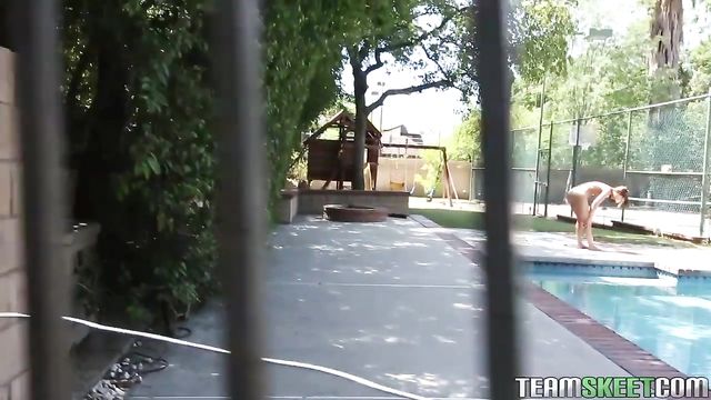 Description: I went out back with my camera to mess with my girl Karter - at the time she was butt naked, oiling herself up for a tan. She was being super shy at first, blocking her face and body, not letting me film her. I gave her my credit card to persuade her to do some stuff with me on camera. We took it inside where she sucked my dick a little before I told her to bend over on the bed. I slid my rod into her tight pussy and watched her ass and tits bounce up and down as I fucked her! It wasnt long until her tight twat made me explode all over her stomach!
