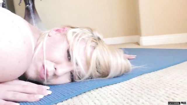 Description: A sexy blonde teen is working out on her yoga mat, despite her ripped or crotchless tights showing off her beautiful shaved pussy and puckered ass. The guy who is watching her is mesmerized, and is soon mounting her from behind. She sucks his cock, and they move from the floor to the bed. She rims him a bit before he resumes taking her doggystyle. She moans and squirms as he pounds her deep, before they move to reverse cowgirl. She sucks him some more, fuck in spoon, and then finish in cowgirl, her pretty ass bouncing up and down as she cums hard with his cock in her cunt.