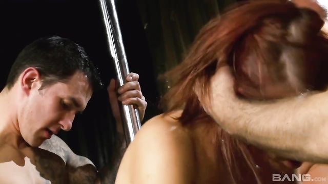 Redhead Roxy Foxxy nicely rammed by three massive loaded dicks