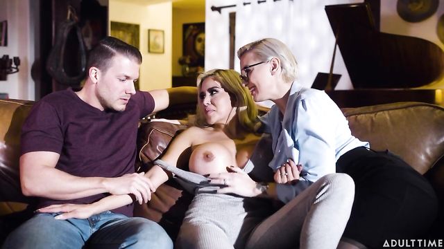 Description:Kenzie Taylor and Caitlin Bell, a married couple, are bickering as Caitlin tries to clean up the living room. Codey Steele, their stepson, is about to enter the living room when he sees them bickering. He is concerned as he observes them briefly. Codey then greets the stepmoms and tries to improve the mood, though it's still tense.Codey becomes more worried, admitting that he's afraid they'll divorce. Kenzie and Caitlin admit to knowing they have things they need to work through, including how to be physically close again. Codey begins suggesting ways for them to reconnect. He starts by suggesting a shoulder rub, which Caitlin and Kenzie agree to.Caitlin gives Kenzie a shoulder rub, slowly reconnecting while there are hints of sparks. Everyone starts to relax, and Kenzie suggests that Codey could give Caitlin a shoulder rub at the same time. Codey agrees to it, and they form a massage train as Codey rubs Caitlin's shoulders while Caitlin continues massaging Kenzie.Feeling much happier, Kenzie and Caitlin apologize to each other for arguing, and get flirty with each other as well. Then they both start to come onto Codey, insisting that his attentiveness is what helped them reconnect and is what they're missing in their lives. They invite him to have sex with them. Codey is shocked, but the stepmoms assure him that this will be a great way to reconnect as a family. He wants to keep the family together, plus his dick is hard from having two beautiful women getting flirty with him, so he gives in. It's time to bring this family even closer together!