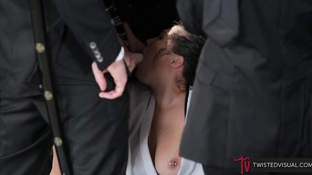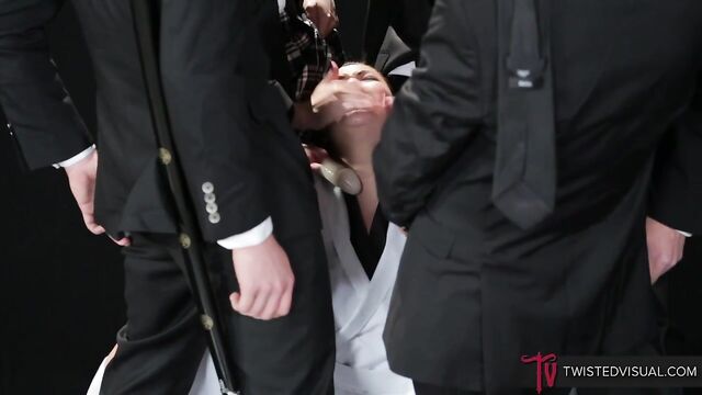 Description:Pretty babe London Keyes, together with Dana DeArmond, Dana Vespoli, Chad Diamond, and Wolf Hudson, walk slowly toward the camera. The boys are wearing a tux while the girls are wearing what seems to be a school uniform. On the other hand, London is wearing a sacrificial robe. The gang comes to a halt. The others surround London. London gets on her knees to suck the boys’ cocks and the girls’ strap-on dildos. She is completely surrounded by real dicks and fake cocks. London tries to suck all of them one by one. Her mouth is constantly kept busy. The gang keeps their dicks close to her face. Her two hands and mouth are not enough to please all the cocks. She continues to ravage their big cocks, their dicks slide deeper into her mouth as she allows her throat and mouth muscles to relax. The sausage fest is just starting. The group laugh at her and spit on her face, but she loves the humiliation; London’s face is now covered in spit. They all take turns shoving their cock into her mouth. Her lips and tongue are constantly moving around. She tries to fit two cocks into her mouth. Dana dunks London’s face in ice-cold water. She strokes London’s neck while she is deepthroating a cock. The blowbang fest gets wetter and messier by the moment. Her face is starting look like a wet rag doll. The gang is not yet satisfied. They jam their cocks into her throat. London turns around as she sucks them in close succession. There is no moment of rest for this little whore. The crew keeps on taking turns inserting their hands, cocks, and dildos into her mouth. They throat-fucked London and dunk her in water until she is gasping for breath. Her labored-breathing echoes throughout the room. London can’t help but groan, moan and scream every time a cock pulls out of her mouth. She is totally overwhelmed by the cocks right on her face. After the wet and messy blowjob fest, the guys shower London with their warm cum. Her face is now full of spit, cold water, and warm cum. They made her into a complete cum basket. They clean her face with ice-cold water.