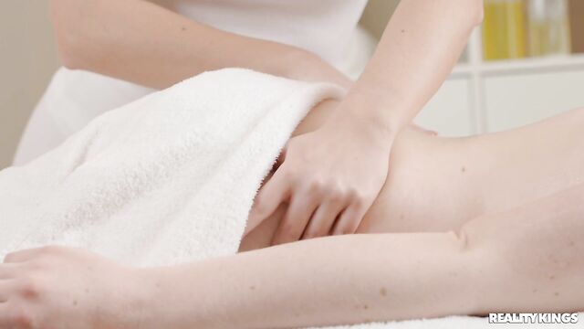 Description:Sarah Calanthe is very eager for her massage with gorgeous blonde Kittina Clariette, because she craves their sexy sessions all week long. Kittina's had a naughty idea for how they can release some extra tension: a strap-on. Sarah can't wait to try it! She strips down and lies on the table for a hot oil rubdown, then Kittina lets her fingers stray to Sarah's wet and eager pussy, fingering her before she puts on the harness and fucks Sarah doggystyle. Sarah moans as Kittina pleases her pussy, then rides the sexy masseuse before it's her turn to don the toy and make Kittina cum!