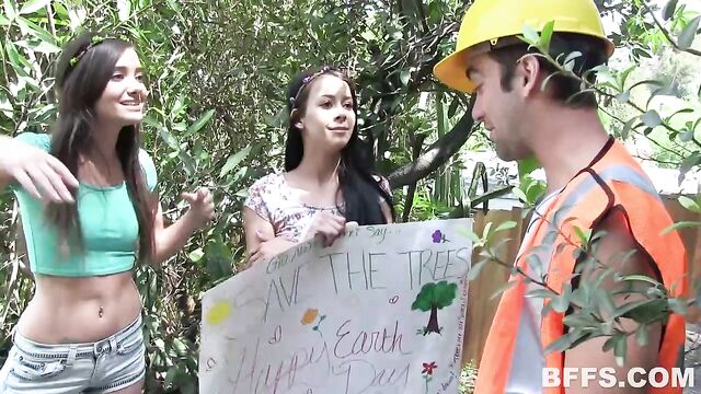 Description: Gia and her friends are all about saving the Earth, going green and all that - so Earth Day is a BIG thing for them! Gia was really bummed to find out that her parents wanted to cut down a tree that they planted when they first moved into the house - a tree that she grew up with! Gia and her friends werent having that and when the guy got there to cut down the tree these friends banded together to stop that from happening! What they didnt expect was for the guy to be so attractive - so when talking to him didnt work Gia turned to something else. They flashed him their boobs and had him squeeze their supple plump tits before dropping to their knees and slowly unbuttoning his pants. Gia and her friend took turns with the cock in their mouths - passing it off to each other and smiling with each lick. Then these girls propped themselves up on the very tree that was getting chopped down and instead got plowed from behind by his other tool! After helping each other get fucked in various positions the woodsman finally spilt his seed all over Gias stomach and tits while her friends watched. Guess what? All their hard work paid off and the tree did not get chopped down this day!