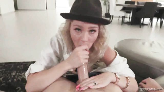 Excited MILF in a black hat Lisey Sweet gives a stunning blowjob