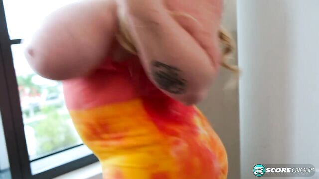 Astonishing curly-haired blonde Holly Wood poses topless by the window