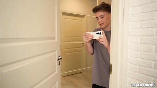 Description: As usual, Anastasia is horny! The petite blonde plays with her tits and humps a pillow while stretching her ass with a butt plug... not realizing her roommate Dima is spying on her again. When she catches him recording her, she sucks his cock, then kicks him out so she can go back to her pillow, but Dima decides to give this little nympho what she really wants: a cock in her booty!