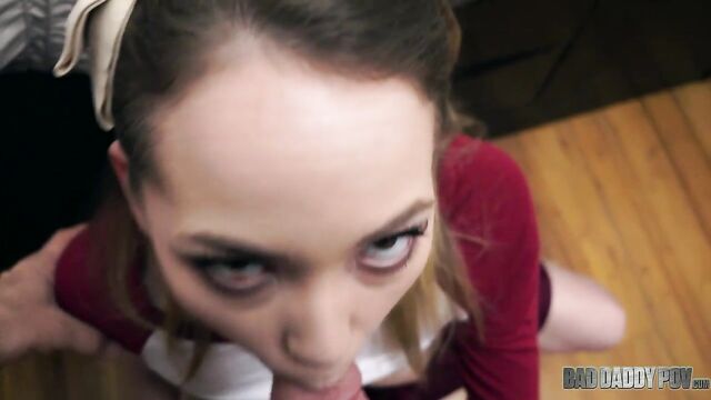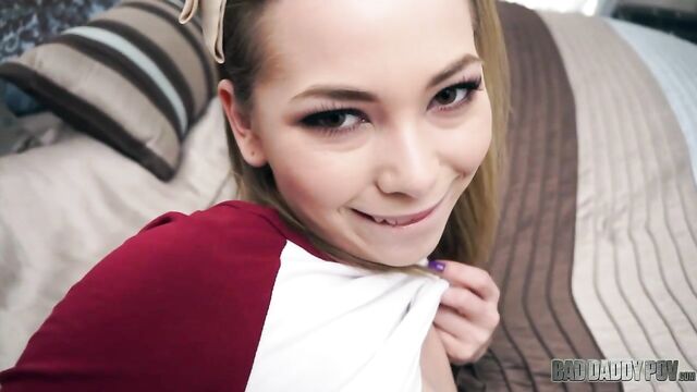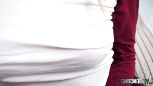 Description:Petite babe Angel Smalls sits apologetically in the bed when her step-father enters the door. This little blonde was sent home from school for flashing her shaved pussy to other students. Her step-dad tries to scold her but her seductive face keeps him from doing so. Angel asks her step-dad to keep what happened at school as a secret. Angel’s attention is fixed to his crotch. She tries to reach for it and grab his step-dad’s hard dick. Her step-father can’t resist the allure of her sexy body. He lifts up her t-shirt then caresses her little perky tits. Angel sucks his dick hard. She licks the shaft then sucks the tip. She tries to fit the huge cock into her tiny mouth. Her step-father leads her to the bed. She bends down her body to make her ass stick out more. The two fuck in a doggystyle position on the bed. Angel looks back at her step-father, begging for more hard fucking. He continues to pound her little pussy with his dick. He lets Angel taste her own pussy juice by sucking his cock. Angel gets on top of her step-father and fucks her in a cowgirl position. She plays with her clitoris while his cock is deep inside her. He pulls out his cock and turns her step-daughter around. They change their position from cowgirl to reverse cowgirl. Her cute butt bounces a little when his father thrusts his big cock deep into her pussy. The two change their position from reverse cowgirl to missionary. Her step-dad continues to fuck her until he feels like he is about to cum. He pulls out his dick from her pussy then shoots his load on her step-daughters pretty stomach. Angel plays with his warm cum while giving a playful smile to the camera.