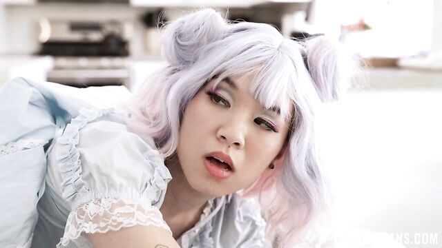 Gorgeous curly-haired Asian doll Kimmy Kim likes riding on a big dick