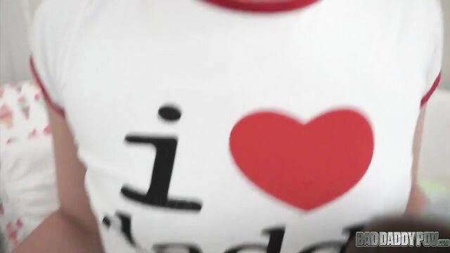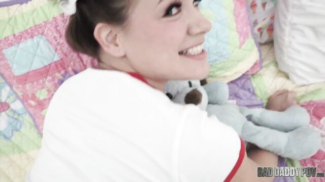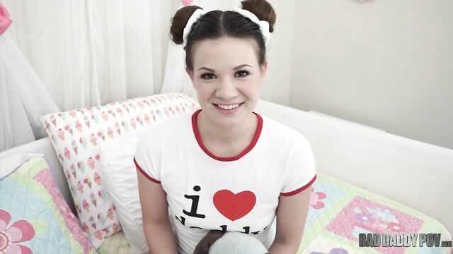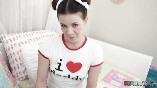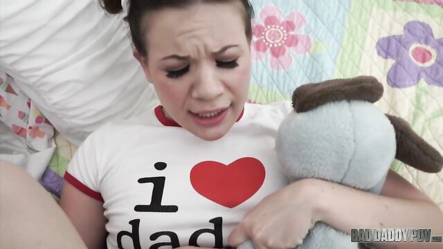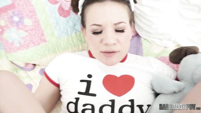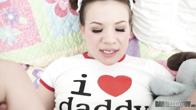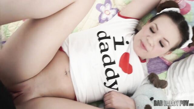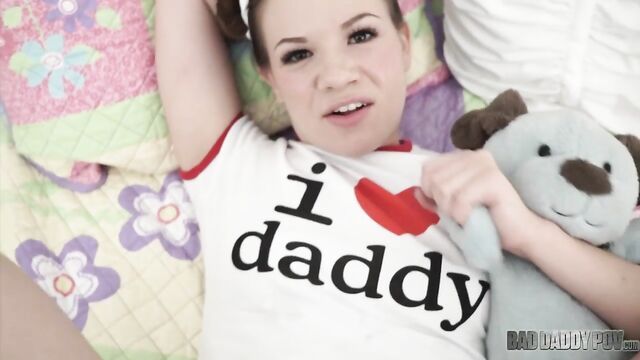 Description:Pretty babe Alison Rey is sitting on her bed when her step-father enters her room. She is wearing a white one-piece shirt with “I Love Daddy” design. It’s father’s day and Alison has a very special present for his step-dad. The cute step-daughter wants to have a special playtime with her step-daddy. Alison pulls down her shorts then starts sucking his cock. He can’t do anything about it anymore so he just let little Alison give him his special father’s day present. She strokes the hard shaft and licks the sensitive head of his penis. Alison continues to worship his step-father’s hard cock. She tried to fit it whole into her tiny mouth but his penis is too big for her. She snaps the button of her one-piece suit and reveals her tight shaved pussy. Alison spreads her legs apart to make her wet pussy more visible for her step-daddy. He can’t contain himself any longer so he immediately stuffs his hard cock into her tiny pussy. He starts slowly and then gradually builds up the pace. Alison hugs her stuffed toy tightly while her step-daddy pounds her pussy. They changed their position from missionary to doggystyle. Alison looks back at him while he fucks her from behind. Her sweet eyes are glued to him as if she is begging for more fucking. Her step-dad keeps on pounding her tight little pussy. Every thrust makes her bubble butt wriggle a little. Alison’s sweet moans start to fill up the room. She cums loudly as her pussy wraps tightly on her step-father’s dick. Alison tastes her pussy juice by sucking on his step-dad’s cock. She cleaned all her juices on his shaft using her tongue and lips. He lies down on the bed and pulls her on top of him. They fucked in a cowgirl position on the bed. She humps his dick while slowly pulling up her shirt. Her busty tits bounce around wildly as he pounds her pussy. He let her suck his dick one more time before fucking her in a missionary position. When he feels that his cum is about to explode, he pulls out his dick from her pussy. He shoots out all his load to her body and face. Her pretty face is now covered in cum. She gives her step-dad a playful smile. She hopes that he likes her special father’s day present.