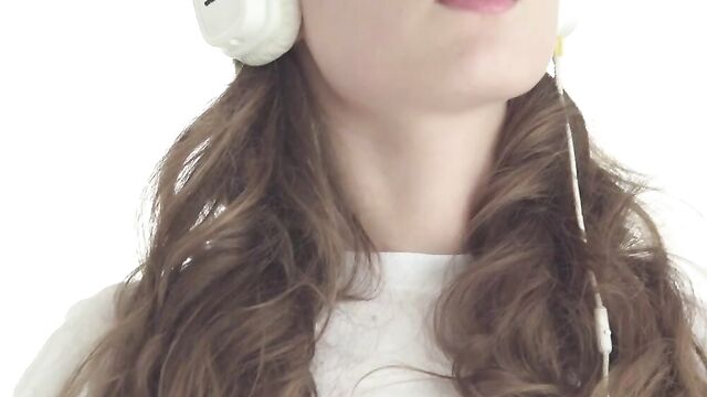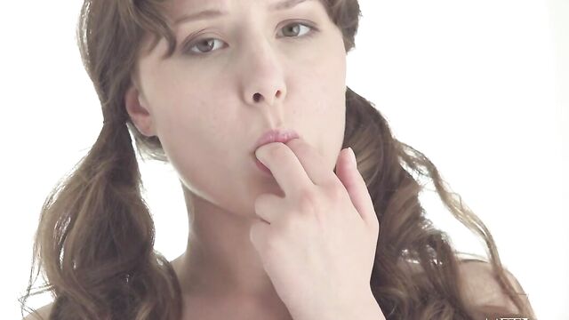 Description: Cute brunette Satin Stone is on her bed grooving on her hands and knees, listening to some music on her headphones. She's wearing a snug pink skirt and white T-shirt, a pair of pastel pink ankle socks on her feet. She wiggles and wriggles, shaking her ass at you, her panties on show beneath the hem of her skirt. She's in another world in those headphones, one in which she's happy to lift her top and caress her naked breasts, slip her hand down between her thighs and stroke herself through her panties. That gets her turned on and then she's rubbing at her clit, licking her finger and pulling her panties aside to strum her slit some more. She takes off her top and skirt, sweet titties jiggling as she slips her skirt down, then she down on her knees with her ass right in front of you, panties around her thighs, stroking her shaved pussy. Soon, she's naked but for her socks, the headphones put aside, two fingers deep inside her tight hole as she masturbates hard.