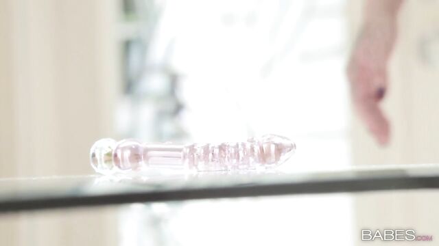 Impressive busty blonde Emma Mae is soloing with a dildo