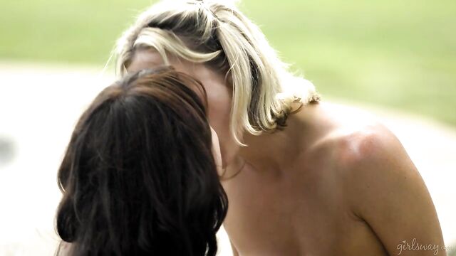 Description: Aiden Ashley is a newly-out lesbian who is fresh from a recent divorce. She decides to shake things up a little by learning a new skill: swimming- but when she arrives at the swimming lesson location... she gets second thoughts. Just as she's about to make her way out, however, she is stopped by her new instructor, Whitney Wright, who asks her why she won't give the swimming class a chance. Aiden hesitates a moment and then reveals that she feels self-conscious about her body. Aiden looks at Whitney's bikini admiringly and says that if she wore something like that, she wouldn't look sexy in the least bit.Whitney can't help but disagree- she thinks that Aiden has an exquisite body, and would look sexy in ANYTHING that she wore. But Aiden isn't only self-conscious about her body, she's also worried that she'll look stupid in the ugly bathing suit she brought. Whitney agrees that the bathing suit leaves much to be desired, but she's determined to make Aiden feel like the goddess she truly is. She takes out a bikini and offers it to Aiden- it's never been tried on and she always keeps extras just in case her students forget theirs. Aiden agrees and leaves to go get changed. As Aiden slips in her new red bikini inside the house, she shoots peeks at Whitney as she rubs suntan lotion on her arms and thighs outside by the pool.When Aiden comes out of the house, Whitney is in awe of how sexy she looks in the bikini. Aiden seems happier, and more confident about her body. She thanks Whitney, and explains that it's been hard for her to feel beautiful these days- especially after her recent divorce. When Whitney shares that she's a lesbian as well, and offers to introduce Aiden to her friends and the rest of the community if she would like. Aiden is heartwarmed- she would love that, and that's actually one of the reasons she booked this swimming lesson: to get out of her comfort zone and meet new people. She's happy that she did- Whitney's taught her a whole lot already- she wonders what ELSE she can teach her. Whitney grins, mentioning that since she is SUPER early and the other swimmers won't be arriving for a while, she COULD lead Aiden in a little pre-swim warm-up. Aiden agrees, and they have playful sex on the poolside where Aiden will demonstrate just how deep she is willing to dive into her new sexuality.
