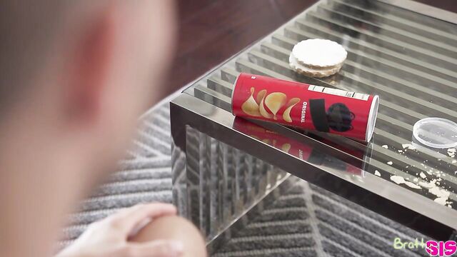 Description: Codey Steele really loves potato chips. His stepsister, Alex Kane, points out that he's addicted. She goes on to wonder if Codey is going to pull a prank on her like putting his dick into a potato chip can and having her pull it out. Codey claims he won't, to which Alex mumbles that that's good because it might get stuck. She knows she's messed up as soon as the words leave her mouth, but Codey wants to know more about when his stepsister has seen his dick. Alex tries saying that Codey leaves the door open when he's showering, which Codey immediately denies.Immediately after Alex leaves, Codey goes back to eating potato chips. First he gets one hand stuck, and then the other hand gets stuck in another can. When Alex returns to the room, she mocks Codey. He begs her to help him, so she drops to her knees and pulls his pants down so his stiffie springs free. Codey claims this isn't helping, but Alex begs to differ. Soon enough, her mouth and hands are busy delivering a combo BJ and handie.Sucking isn't enough for this cum hungry coed, so she gets on her knees so Codey can do her from behind in doggy. Then she climbs into his lap and bounces away in reverse cowgirl. Only then does she help Codey get his hands free from the chip cans so that he can fuck her properly. Codey delivers, driving up into Alex's greedy cooch and then pistoning in and out of her juicy snatch as she lays on her back with her legs spread wide. Once Codey has pulled out and blown his nut all over her shaved puss, Alex grabs a few spare chips to munch.
