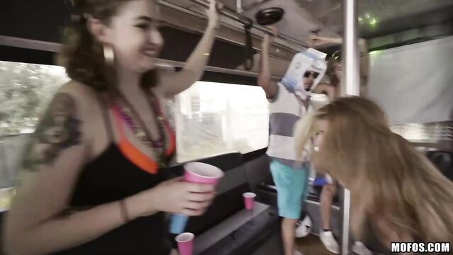 Description: Arya is stranded on the way to spring break, but there's help on the way! When the hot blonde spinner is offered a ride on a party bus full of wild students, she says thank you by giving a strip show to the crew, then sucking and fucking the host!