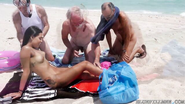 Description: So the old boys are on a beach adventure today. Duke had come across a hot little Latina named Nikki Kay at the mall. They had come to an agreement to meet at the nude beach. They were full of excitement as Duke described how pretty and sexy this girl was. Sure enough, when they arrived, they found Nikki tanning and looking so sexy. Soon after, her top came off, exposing her sweet titties and puffy nipples. The old gents then lathered her up with suntan lotion and she was kind enough to return the favor. Finally, they headed back home. Nikki dropped down on her knees and gave two of the boys a great blowjob. Then Duke took over and gave her a really good fuck while his buddies looked on. Who needs to go away on vacation when you got hotties like this at home!
